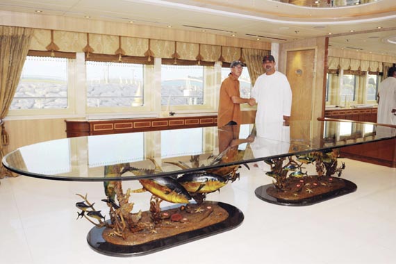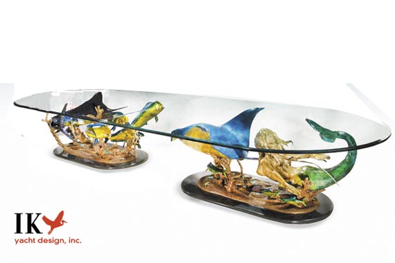 Yacht interior design. Outfitted this 280′ Super yacht wit custom furnishings, furniture and accessories, including two original custom designed bronze dining tables.